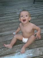 the kids love coloring on the deck with sidewalk chalk. Sometimes Cam tries to eat the chalk. And yes he does have a ponytail in his hair, Mariah got some new hair ties at the dollar store and wanted to share with her brother. I thought it would be funny, Kyle didn't think so. At least it was a blue one right?